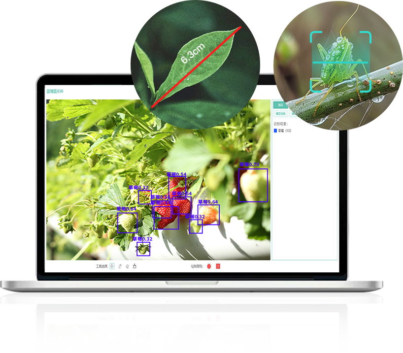 自研AI算法平臺,增強圖像采集、分析計算和數據智能處理能力,提供測定植株高度、葉片大小、識別病蟲害、計算果實數量等功能,更有用戶自主A1模型訓練、推理功能,為作物生產決策、病蟲害識別診斷、產量預估、災害監測等作業需求提供了更精準、更智能的解決方案,高效助力作物生產管理工作。